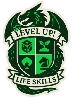 A green and black dragon crest badge featuring symbols of a die, a plant sprout, a tree, and a horse's head with the banners 'Level Up!' and 'Life Skills'.