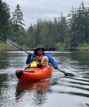 Person in a kayak on a river with a small dog, surrounded by green trees and overcast sky.