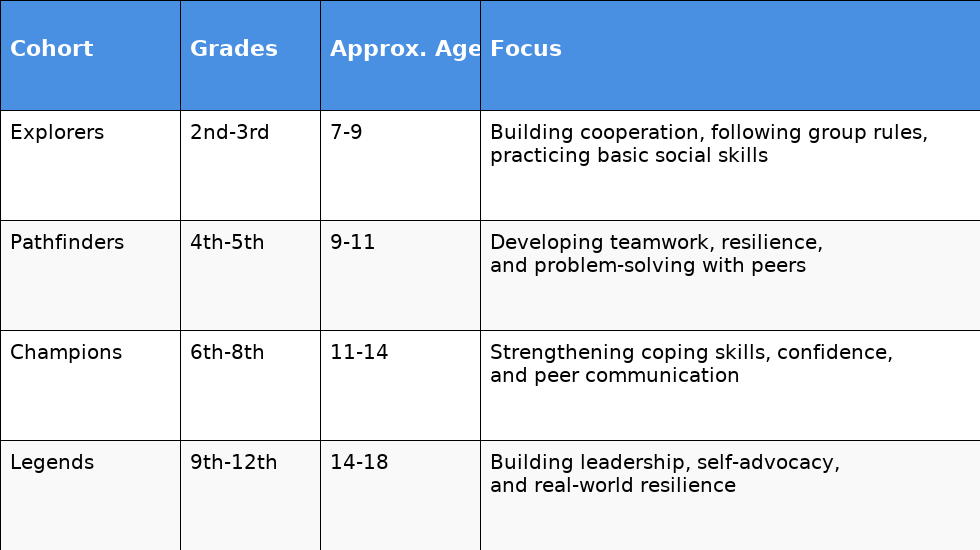A table outlining various youth development cohorts categorized by name, grade levels, approximate age, and focus areas. The cohorts include Explorers, Pathfinders, Champions, and Legends, each targeting different age groups and developmental goals.